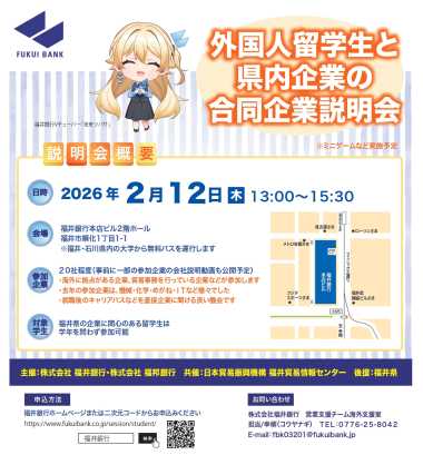 2/12(木) 福井銀行主催 「外国人留学生と県内企業の合同企業説明会」に参加します!